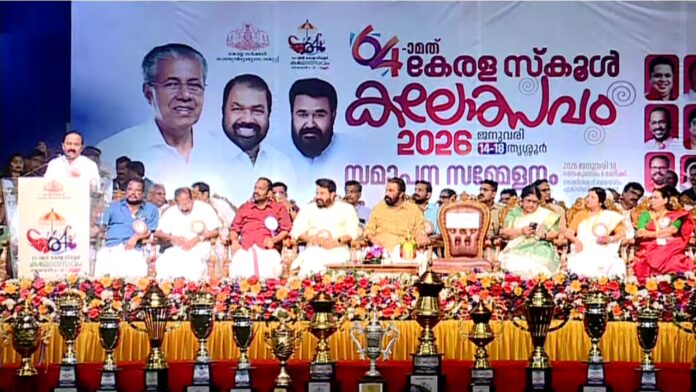 തൃശൂര്: സംസ്ഥാന സ്കൂള് കലോത്സവത്തിന് തൃശൂരിൽ കൊടിയിറക്കം. സമാപന സമ്മേളനം പ്രതിപക്ഷ നേതാവ് വിഡി സതീശൻ ഉദ്ഘാടനം ചെയ്തു. നടൻ മോഹൻലാൽ മുഖ്യാതിഥിയായി. സമാപന സമ്മേളന ഉദ്ഘാടന പ്രസംഗത്തിൽ മന്ത്രി വി ശിവൻകുട്ടിയെ പ്രതിപക്ഷ നേതാവ് വിഡി സതീശൻ അഭിനന്ദിച്ചു. കലോത്സവ ചട്ടം ഭേദഗതി ചെയ്തുകൊണ്ട് കാസര്കോട്ടെ സിയ ഫാത്തിമക്ക് കലോത്സവത്തിൽ പങ്കെടുക്കാൻ അവസരം നൽകിയതിലാണ് മന്ത്രി വി ശിവൻകുട്ടിയെ വേദിയിൽ വെച്ച് പ്രതിപക്ഷ നേതാവ് വിഡി സതീശൻ അഭിനന്ദിച്ചത്. യാത്ര ചെയ്യാൻ ബുദ്ധിമുട്ട് നേരിട്ട സിയ ഫാത്തിമക്ക് വീട്ടിലിരുന്ന് വീഡിയോ കോണ്ഫറന്സ് വഴി എച്ച് എസ് വിഭാഗം അറബിക് പോസ്റ്റര് രചനാ മത്സരത്തിൽ പങ്കെടുക്കാൻ അവസരം നൽകിയിരുന്നു.